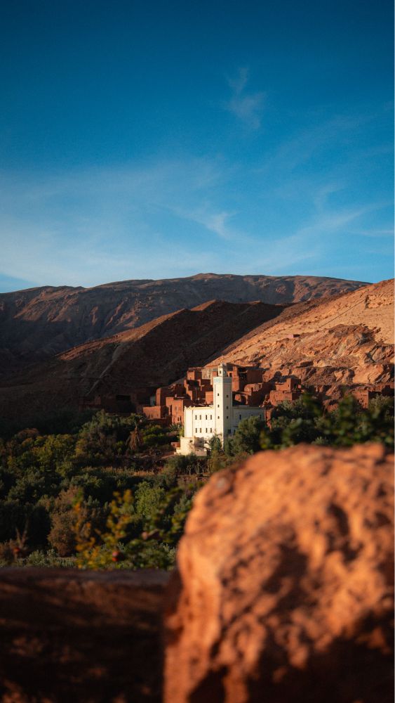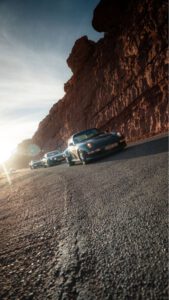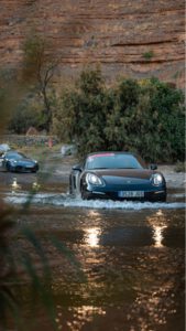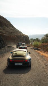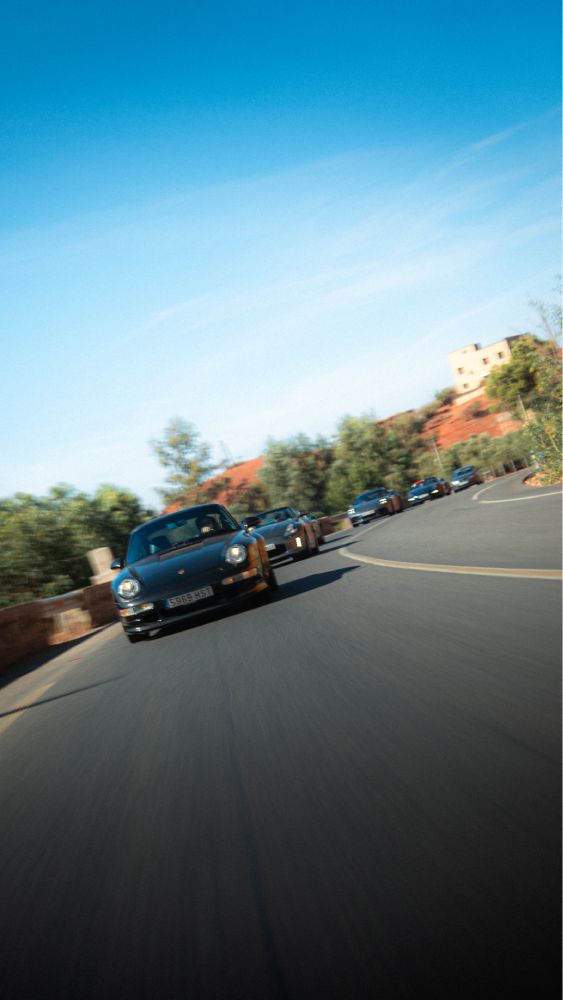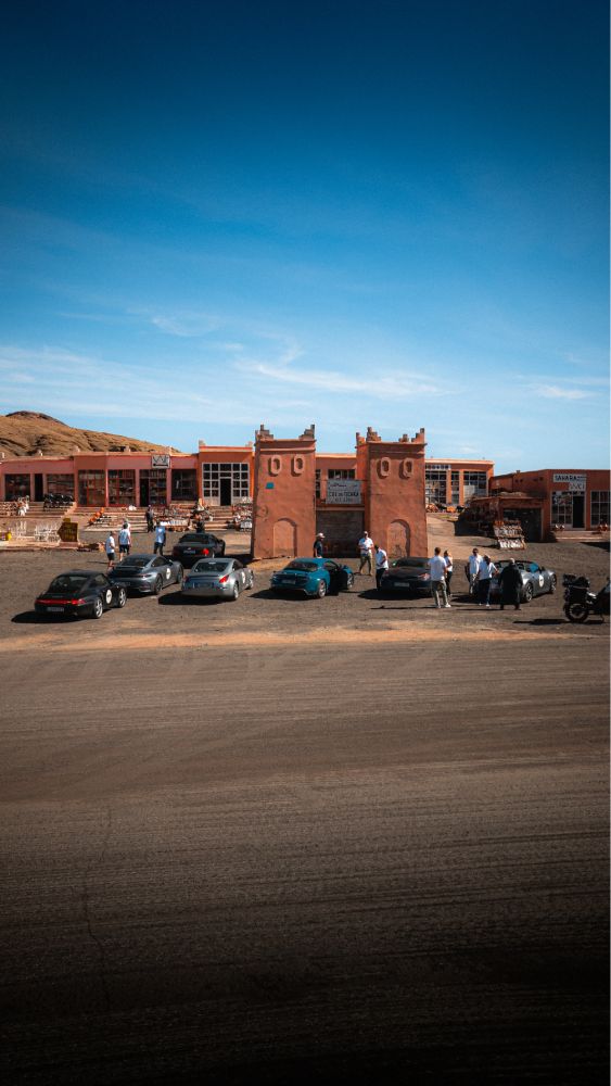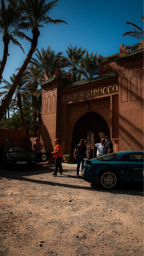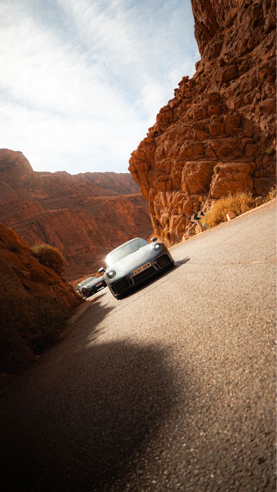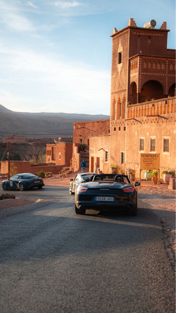 La siguiente ruta fue puro disfrute visual, pues la carretera estrecha en muchos puntos no permitía da rienda suelta a los 395 CV del 911 Carrera T 992 que nos acompañaba, o los 315 CV del Boxster S descapotado. A cambio, el paisaje se tornaba salvaje surcando el borde del valle, con pueblos de barro, kasbash derruidas, mezquitas sobresalientes y abruptos desfiladeros cautivando la mirada de copilotos y en los momentos más lentos, pilotos, que con mucho atino seguían el ritmo del coche líder para disfrutar de las vistas sin peligro.