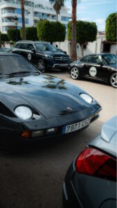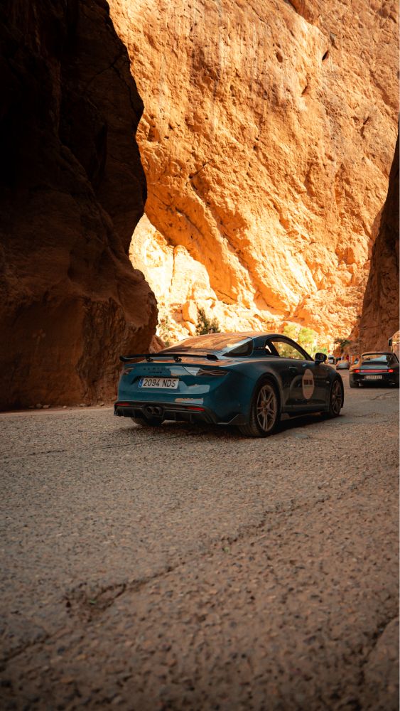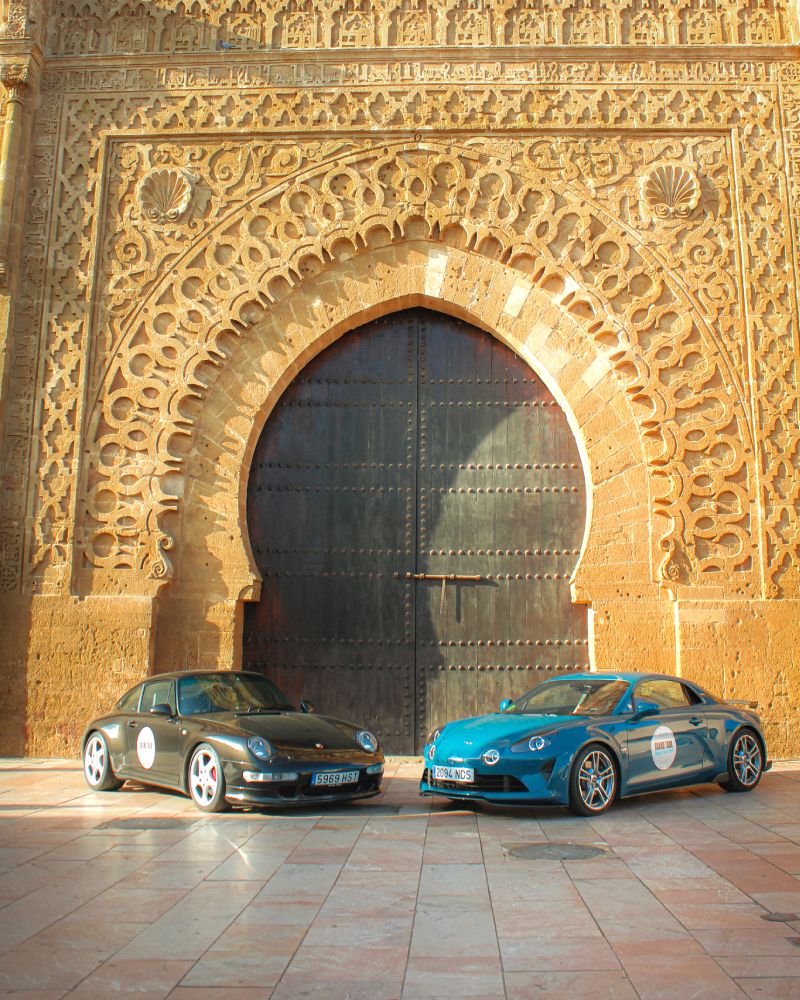 Pero sin duda la estampa única la creamos gracias a los intrépidos Gasaris. Con mucha celeridad y un poco de suerte, logramos ubicar el bonito Alpine A110 GTS de color Azul Paon junto al 911 993 frente al gran pórtico árabe que presidía la pequeña plaza nada más entrar a la Kasbah, una imagen evocadora que combinaba la espectacularidad de los deportivos con el estilo clásico y árabe de la ciudad, y que de pasó sorprendió a los turistas que acababan de desembarcar de su autobús, y claro está, a sus guías, que no simpatizaron mucho con la idea, pero que permitieron amablemente tomar la instantánea.