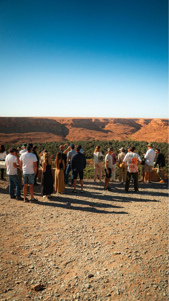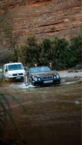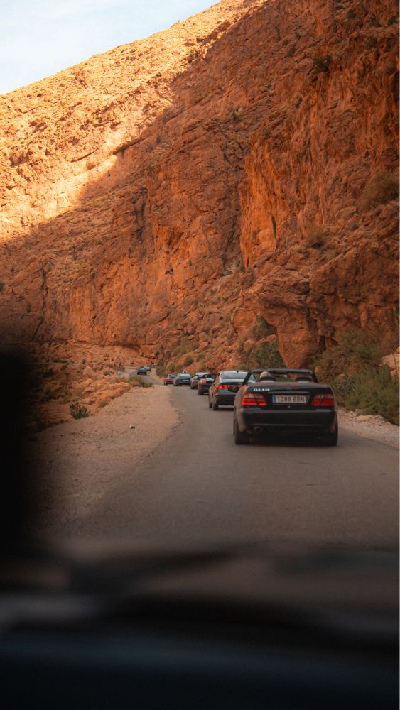 Y no mentía, en 20 minutos nos topábamos con un paso cubierto por el agua. En Marruecos en muchas zonas la carretera sigue la orografía del terreno, lo que significa, que si hay un río, el asfalto se hundirá formando un badén, que en este caso, era acuático. Dar la vuelta era deshacer un camino muy largo, pero aquel Gasari que nos alertó había cruzado, así que el grupo también podía. Efectivamente, con cuidado y por un lado, uno tras otro, todos los coches cruzaron, lo que se convertiría en una anécdota para siempre y un recuerdo único que solo tiene lugar en el Grand Tour Marruecos.
